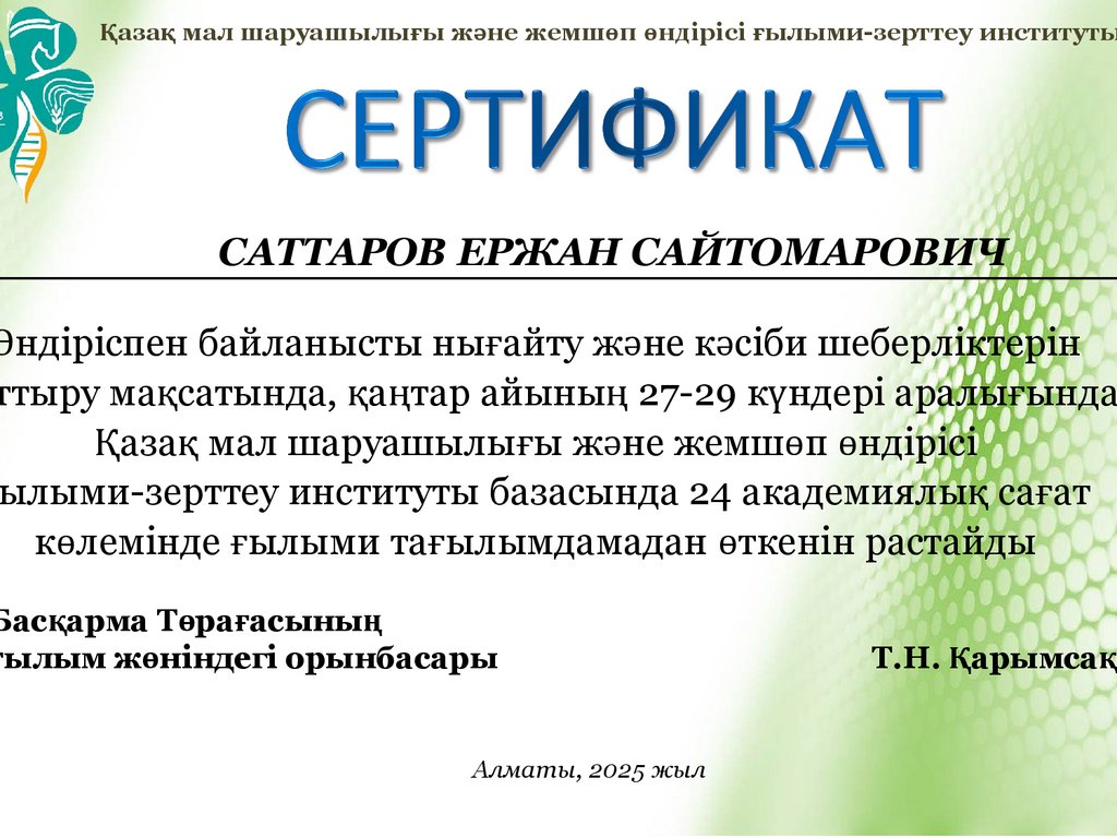 Қазақ мал шаруашылығы және жемшөп өндірісі ғылыми-зерттеу институтыСАТТАРОВ ЕРЖАН САЙТОМАРОВИЧ