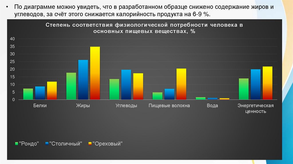 • По диаграмме можно увидеть, что в разработанном образце снижено содержание жиров иуглеводов, за счёт этого снижается калорийность продукта на 6-9 %.