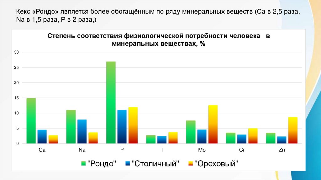 Кекс «Рондо» является более обогащённым по ряду минеральных веществ (Ca в 2,5 раза,Na в 1,5 раза, P в 2 раза,)