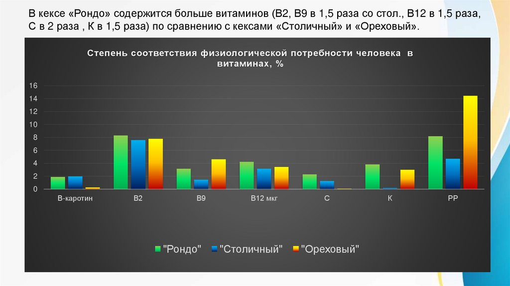 В кексе «Рондо» содержится больше витаминов (В2, В9 в 1,5 раза со стол., В12 в 1,5 раза,С в 2 раза , К в 1,5 раза) по сравнению с кексами «Столичный» и «Ореховый».