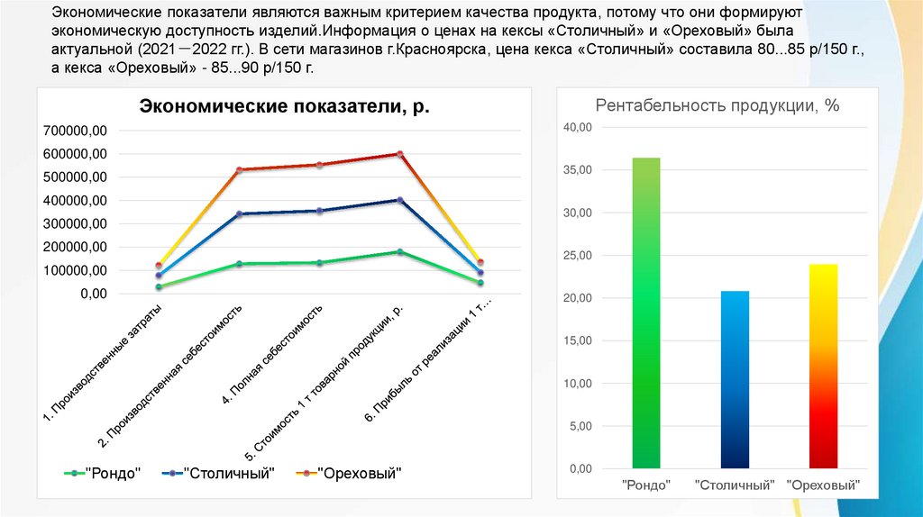 Экономические показатели являются важным критерием качества продукта, потому что они формируютэкономическую доступность изделий.Информация о ценах на кексы «Столичный» и «Ореховый» была