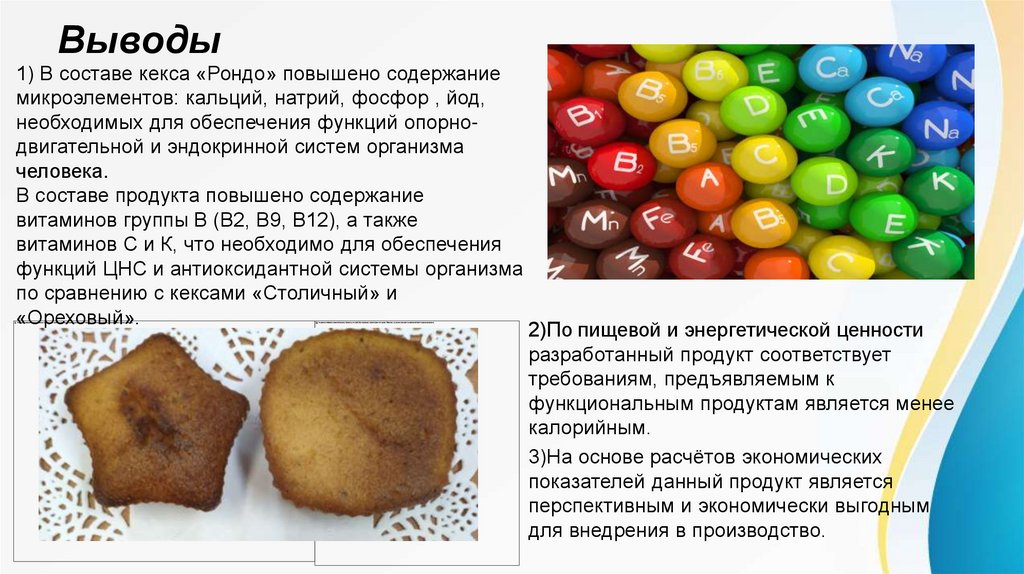 Выводы1) В составе кекса «Рондо» повышено содержание