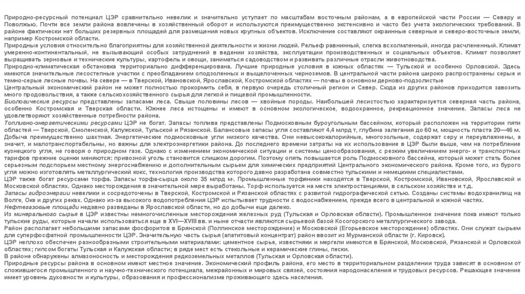 Природно-ресурсный потенциал ЦЭР сравнительно невелик и значительно уступает по масштабам восточным районам, а в европейской части России — Северу иПоволжью. Почти все земли района вовлечены в хозяйственный оборот и используются преимущественно экстенсивно и часто без учета экологических требований. В