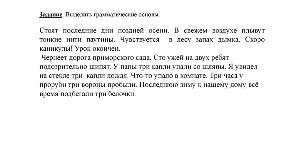 Задание. Выделить грамматические основы.Стоят последние дни поздней осени. В свежем воздухе плывут