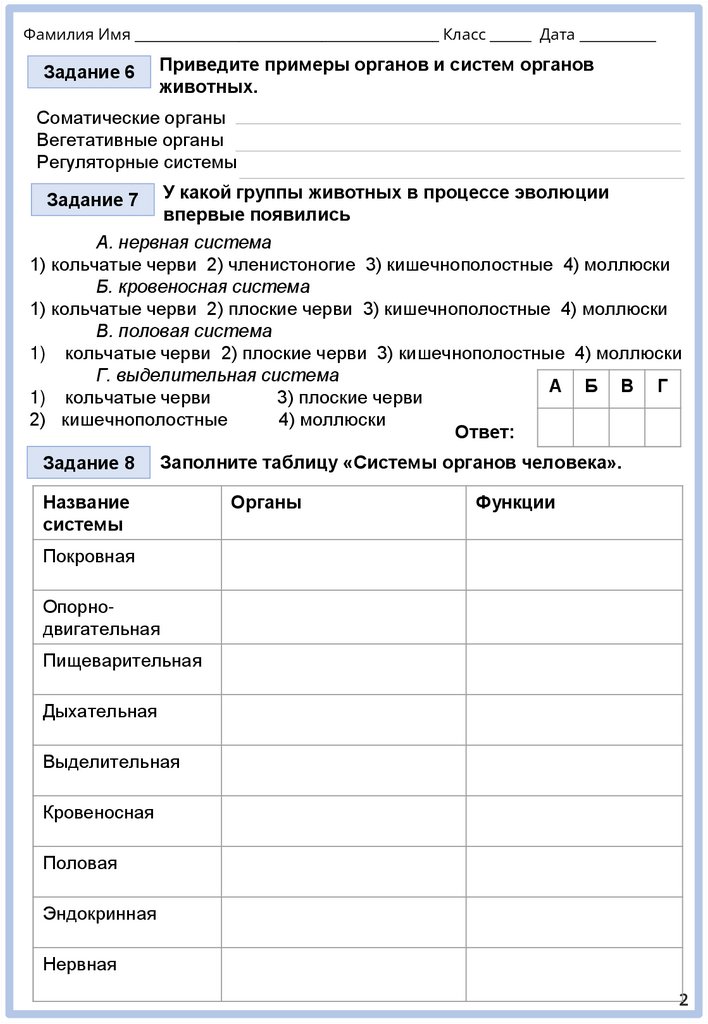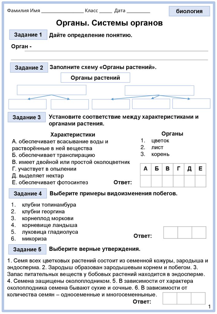 Фамилия Имя ____________________ Класс ______ Дата ___________биология