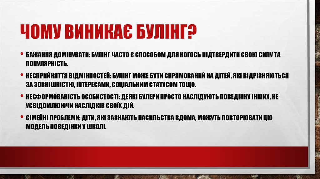 ЧОМУ ВИНИКАЄ БУЛІНГ?• БАЖАННЯ ДОМІНУВАТИ: БУЛІНГ ЧАСТО Є СПОСОБОМ ДЛЯ КОГОСЬ ПІДТВЕРДИТИ СВОЮ СИЛУ ТА