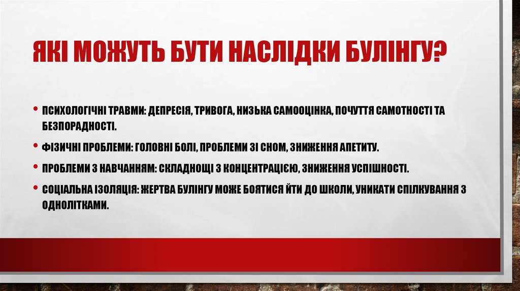 ЯКІ МОЖУТЬ БУТИ НАСЛІДКИ БУЛІНГУ?• ПСИХОЛОГІЧНІ ТРАВМИ: ДЕПРЕСІЯ, ТРИВОГА, НИЗЬКА САМООЦІНКА, ПОЧУТТЯ САМОТНОСТІ ТА