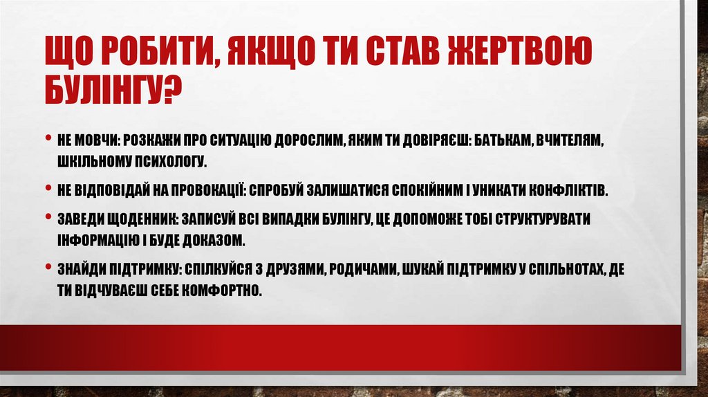 • НЕ ВІДПОВІДАЙ НА ПРОВОКАЦІЇ: СПРОБУЙ ЗАЛИШАТИСЯ СПОКІЙНИМ І УНИКАТИ КОНФЛІКТІВ.