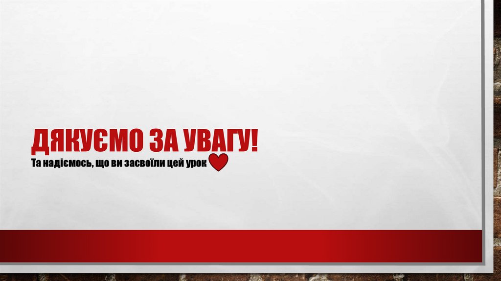 ДЯКУЄМО ЗА УВАГУ!Та надіємось, що ви засвоїли цей урок