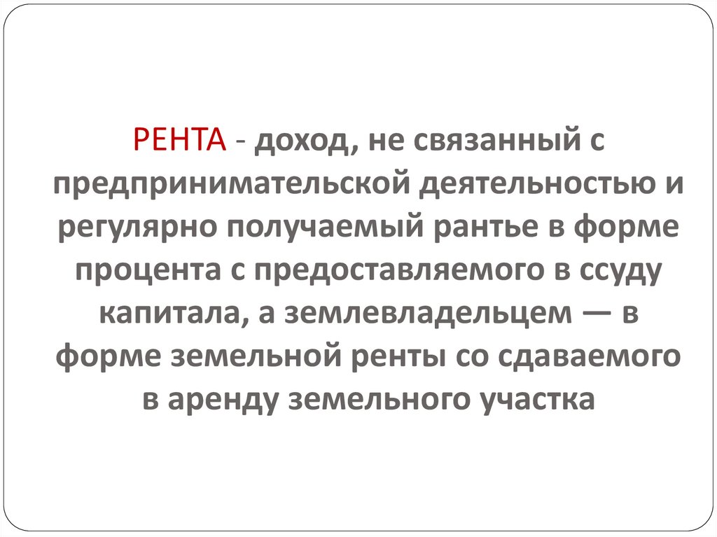21. РЕНТА - доход, не связанный с предпринимательской деятельностью и регулярно получаемый рантье в форме процента с