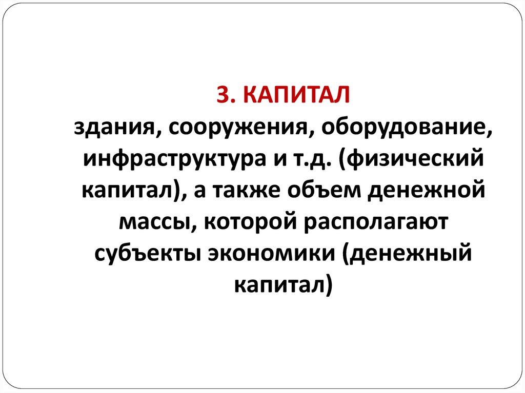 ЗАРАБОТНАЯ ПЛАТА25. 3. КАПИТАЛ здания, сооружения, оборудование, инфраструктура и т.д. (физический капитал), а также объем денежной массы, которой