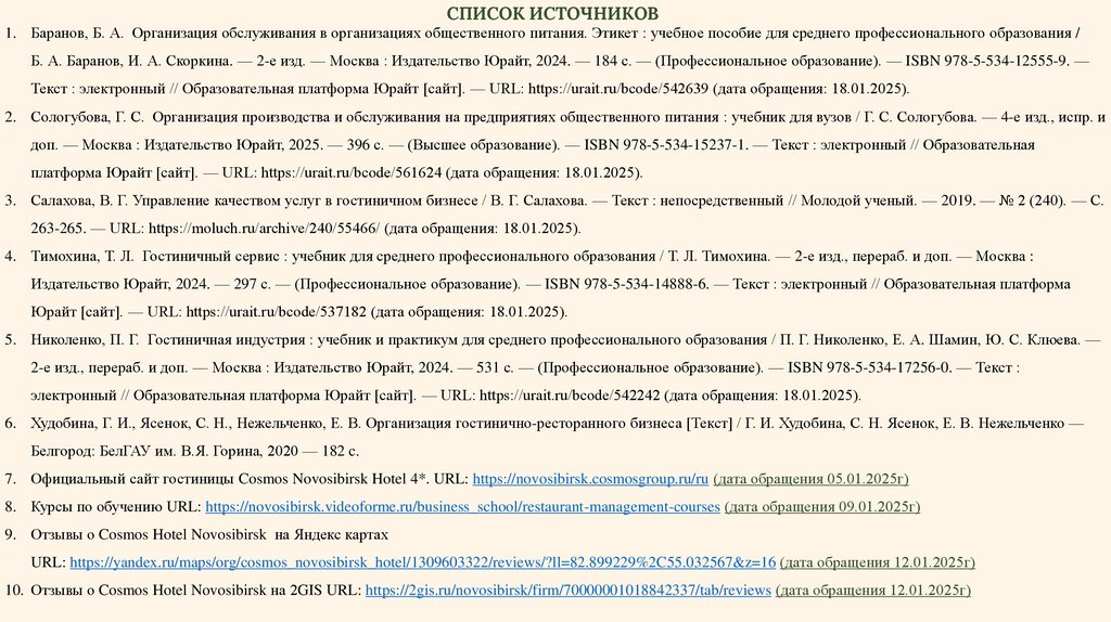СПИСОК ИСТОЧНИКОВ1. Баранов, Б. А. Организация обслуживания в организациях общественного питания. Этикет : учебное пособие для среднего профессионального образования /