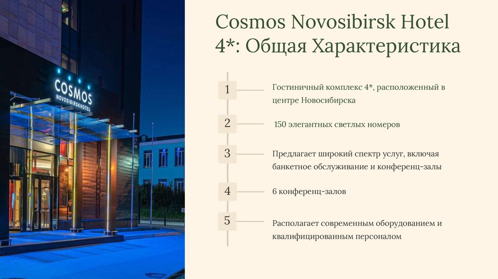 7. Официальный сайт гостиницы Cosmos Novosibirsk Hotel 4*. URL: https://novosibirsk.cosmosgroup.ru/ru (дата обращения 05.01.2025г)