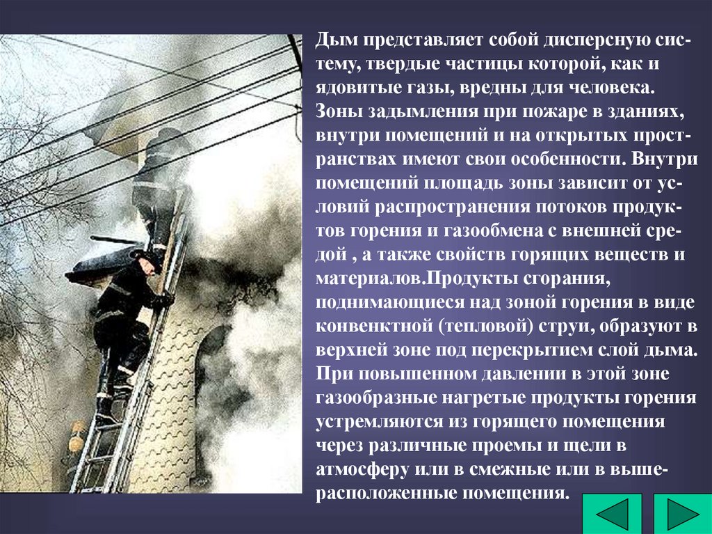 Дым представляет собой дисперсную систему, твердые частицы которой, как иядовитые газы, вредны для человека.