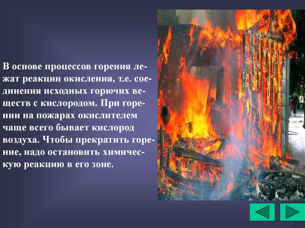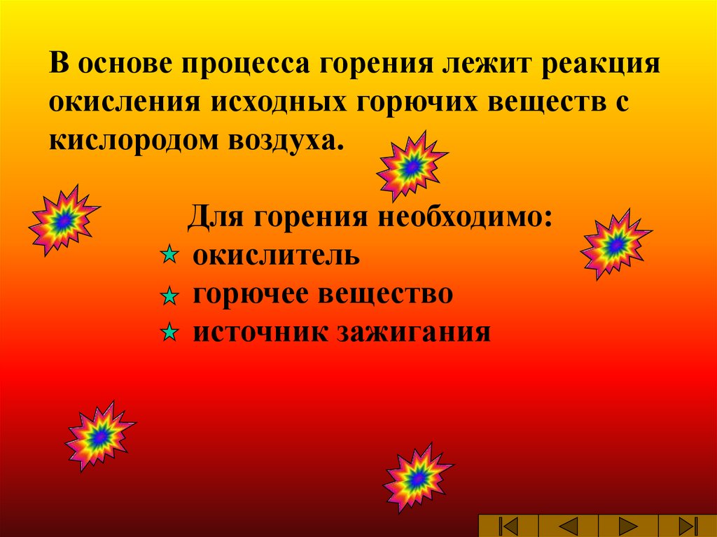 В основе процесса горения лежит реакцияокисления исходных горючих веществ с