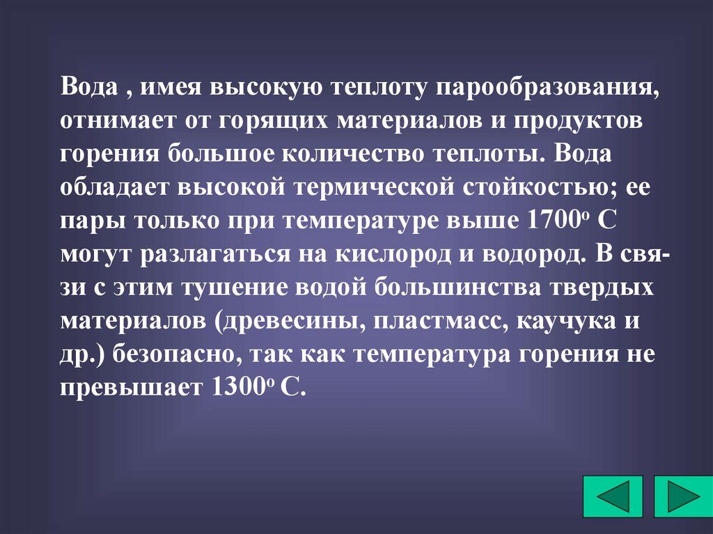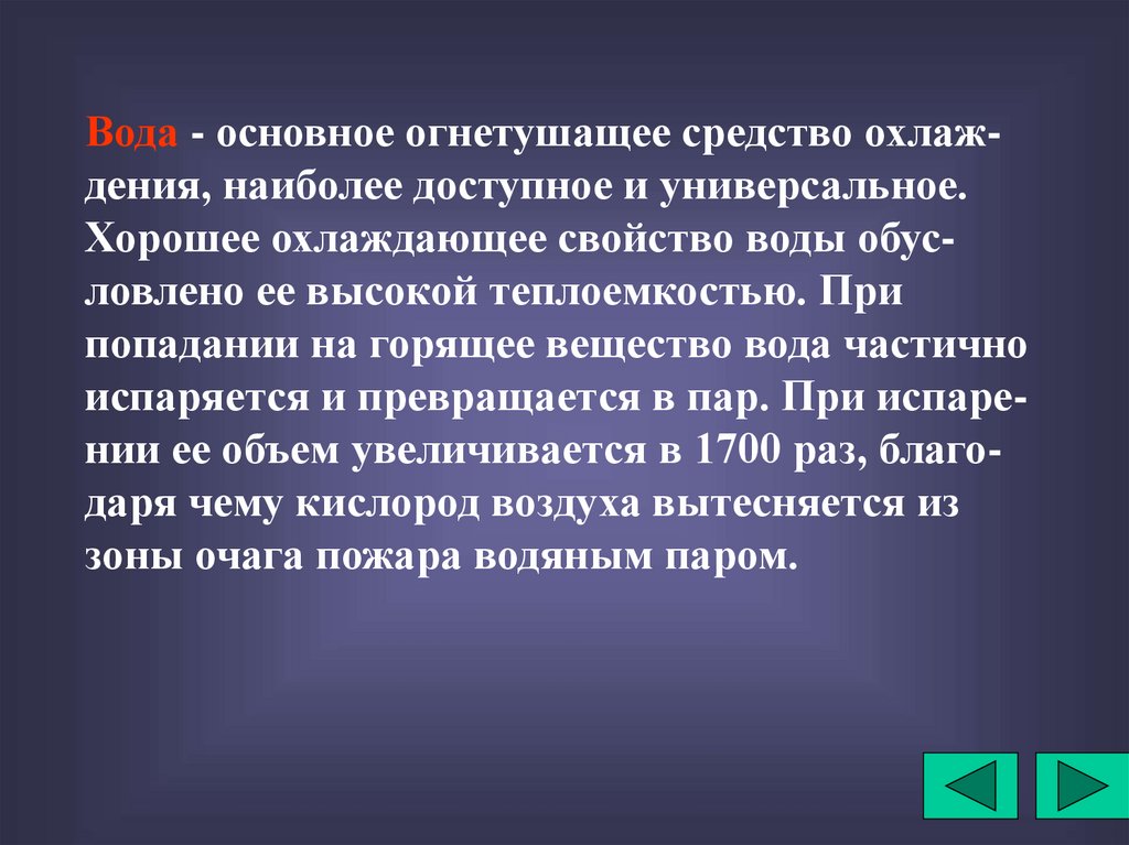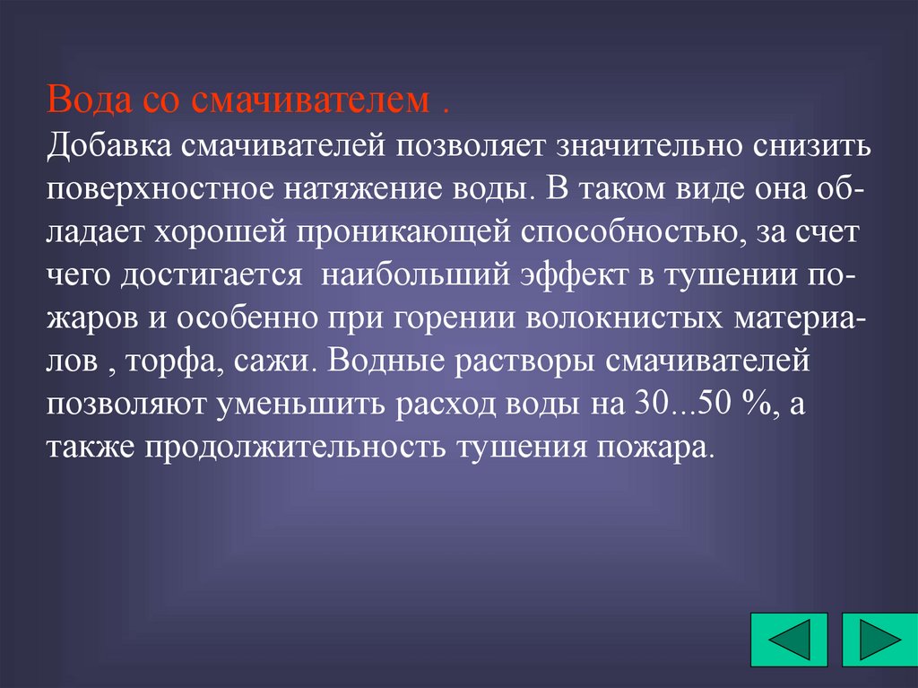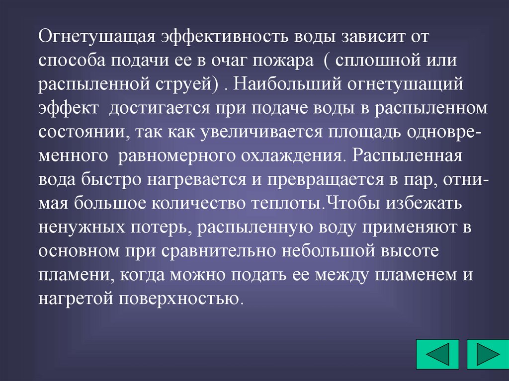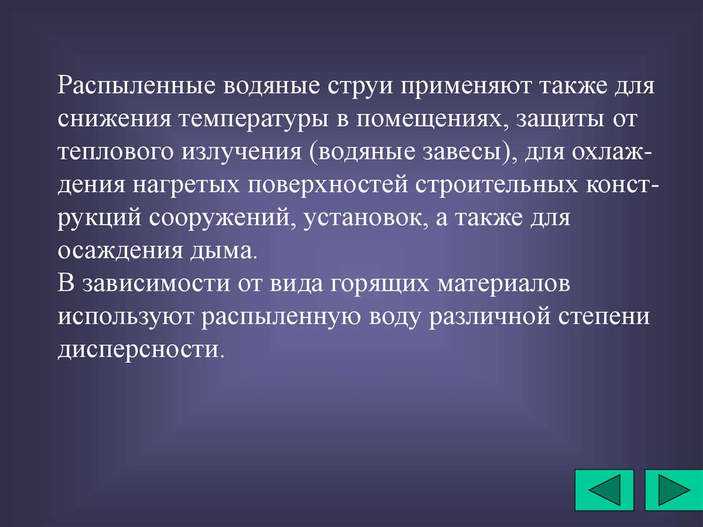 быстрому снижению температуры, осаждению дыма. Тонкораспыленную воду используют не только для тушения горящих твердых материалов, нефтепродуктов, но и для защитных действий.