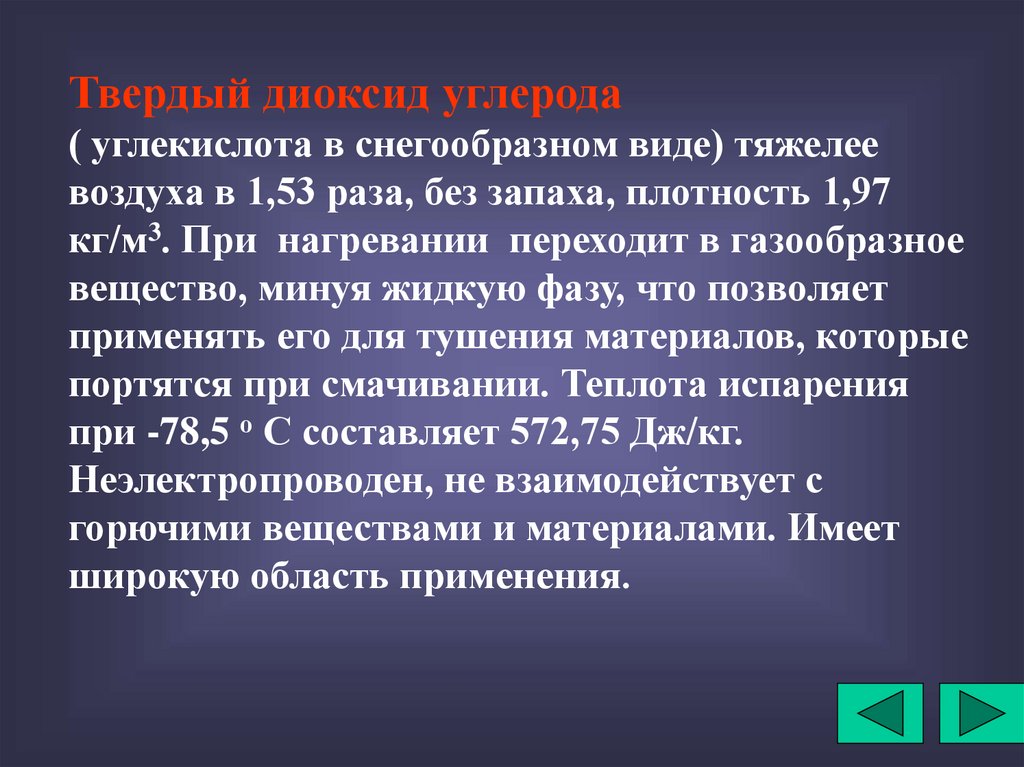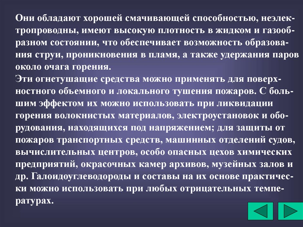 Они обладают хорошей смачивающей способностью, неэлектропроводны, имеют высокую плотность в жидком и газообразном состоянии, что обеспечивает возможность образования струи, проникновения в пламя, а также удержания паровоколо очага горения.