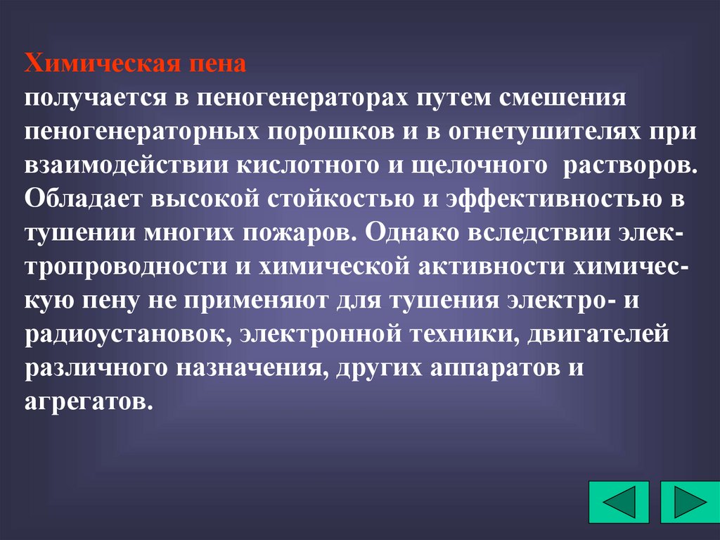 тушении многих пожаров. Однако вследствии электропроводности и химической активности химическую пену не применяют для тушения электро- и