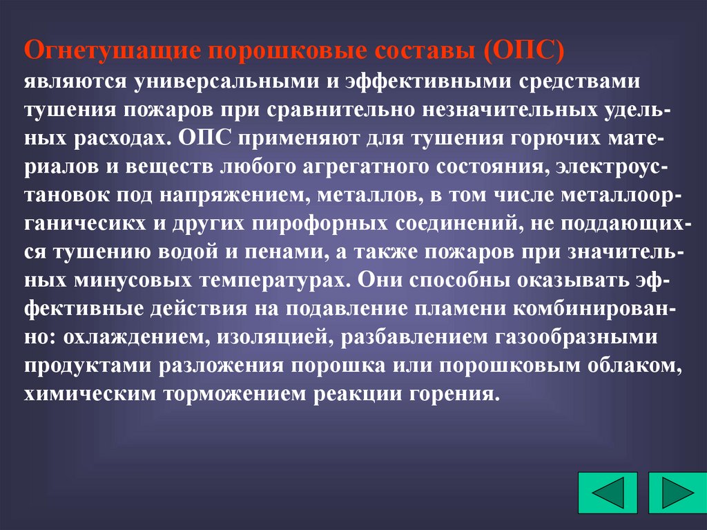 тушения пожаров при сравнительно незначительных удельных расходах. ОПС применяют для тушения горючих материалов и веществ любого агрегатного состояния, электроустановок под напряжением, металлов, в том числе металлоорганичесикх и других пирофорных соединений, не поддающихся тушению водой и пенами, а также пожаров при значительных минусовых температурах. Они способны оказывать эффективные действия на подавление пламени комбинированно: охлаждением, изоляцией, разбавлением газообразными