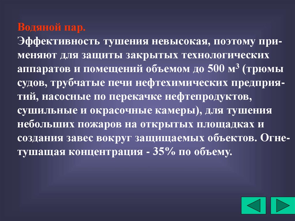 Водяной пар.Эффективность тушения невысокая, поэтому применяют для защиты закрытых технологических