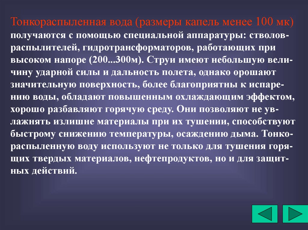 Тонкораспыленная вода (размеры капель менее 100 мк)получаются с помощью специальной аппаратуры: стволовраспылителей, гидротрансформаторов, работающих при