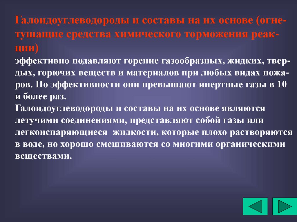 Галоидоуглеводороды и составы на их основе (огнетушащие средства химического торможения реакции)эффективно подавляют горение газообразных, жидких, твердых, горючих веществ и материалов при любых видах пожаров. По эффективности они превышают инертные газы в 10