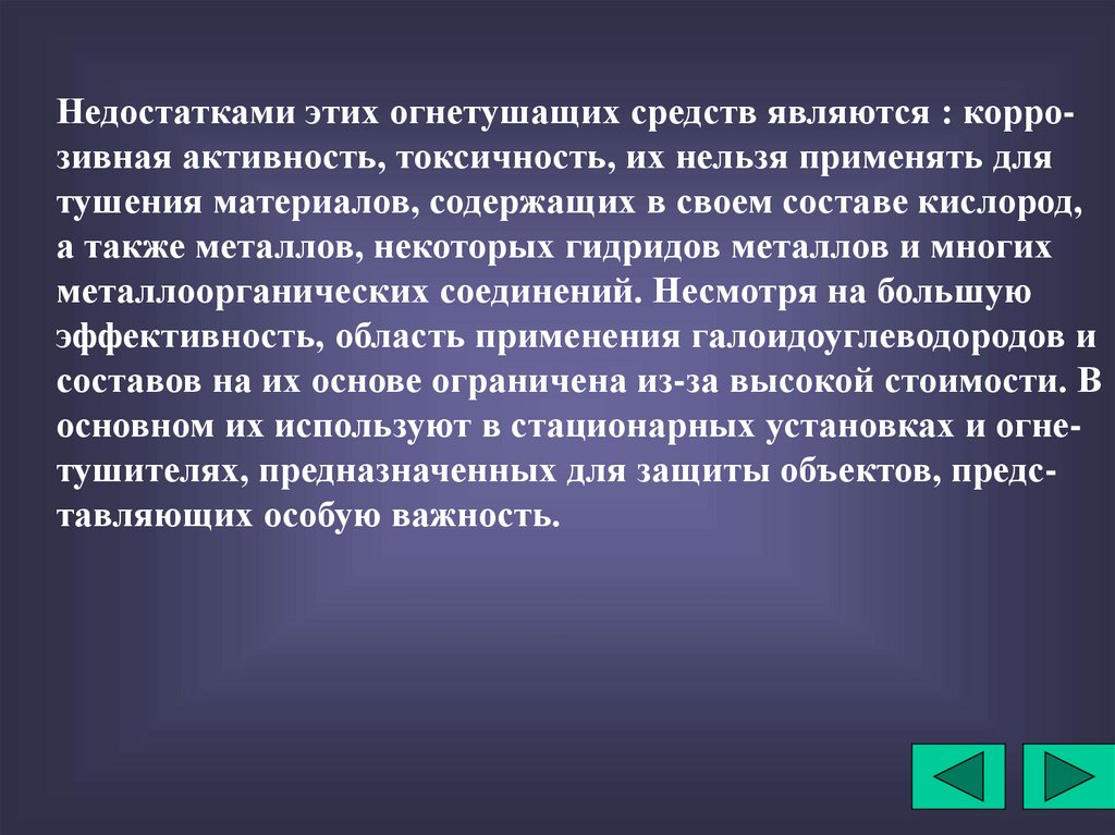 Недостатками этих огнетушащих средств являются : коррозивная активность, токсичность, их нельзя применять длятушения материалов, содержащих в своем составе кислород,