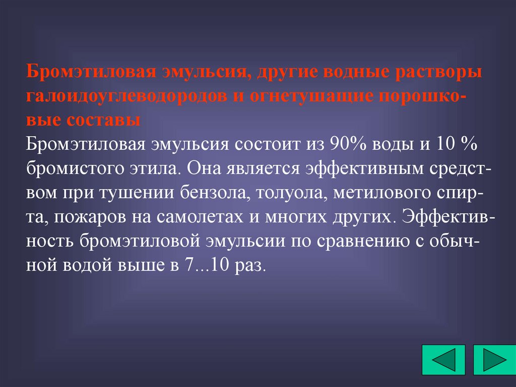 бромистого этила. Она является эффективным средством при тушении бензола, толуола, метилового спирта, пожаров на самолетах и многих других. Эффективность бромэтиловой эмульсии по сравнению с обычной водой выше в 7...10 раз.