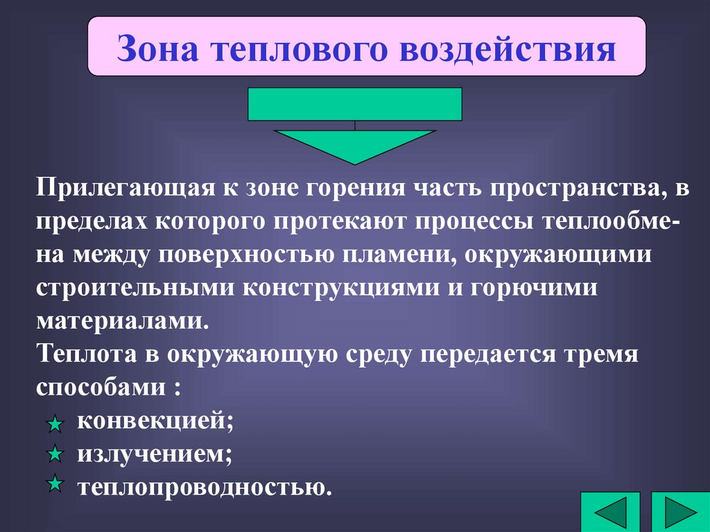 Зона теплового воздействияПрилегающая к зоне горения часть пространства, в