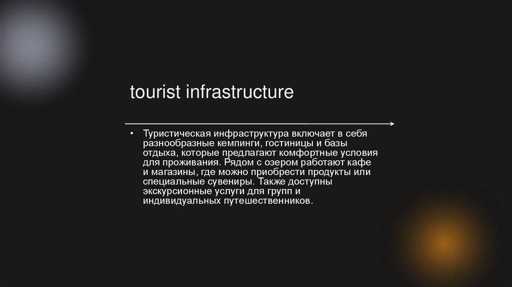 tourist infrastructure• Туристическая инфраструктура включает в себя