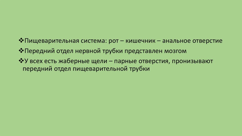 Пищеварительная система: рот – кишечник – анальное отверстиеПередний отдел нервной трубки представлен мозгом