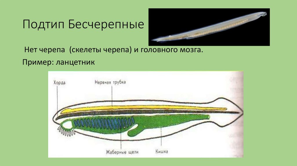 Подтип БесчерепныеНет черепа (скелеты черепа) и головного мозга.