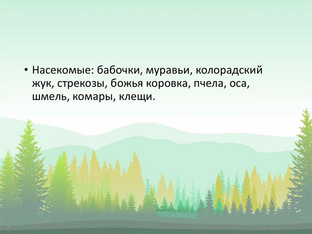 • Насекомые: бабочки, муравьи, колорадскийжук, стрекозы, божья коровка, пчела, оса,