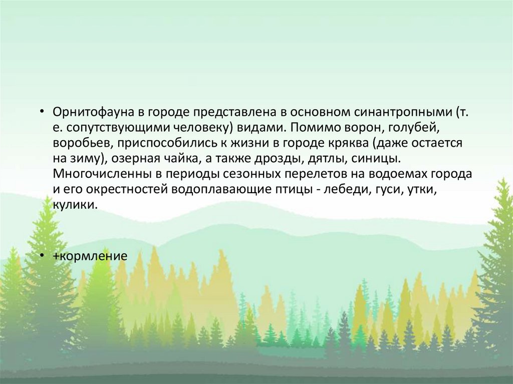 • Орнитофауна в городе представлена в основном синантропными (т.е. сопутствующими человеку) видами. Помимо ворон, голубей,