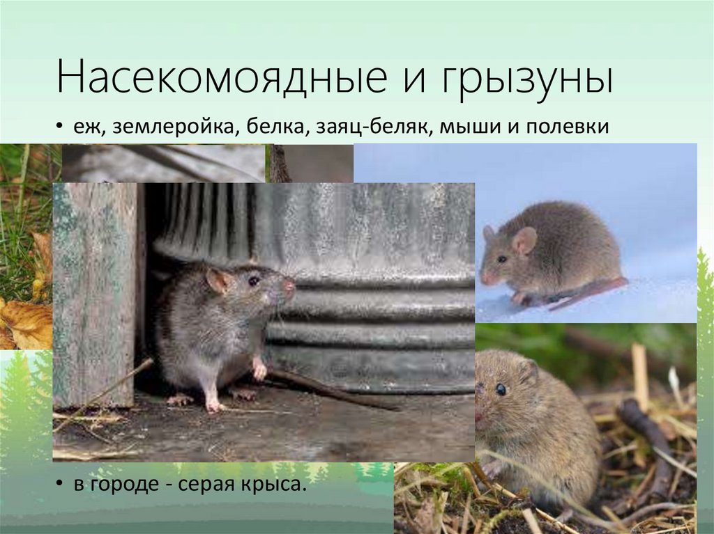 Насекомоядные и грызуны• еж, землеройка, белка, заяц-беляк, мыши и полевки
