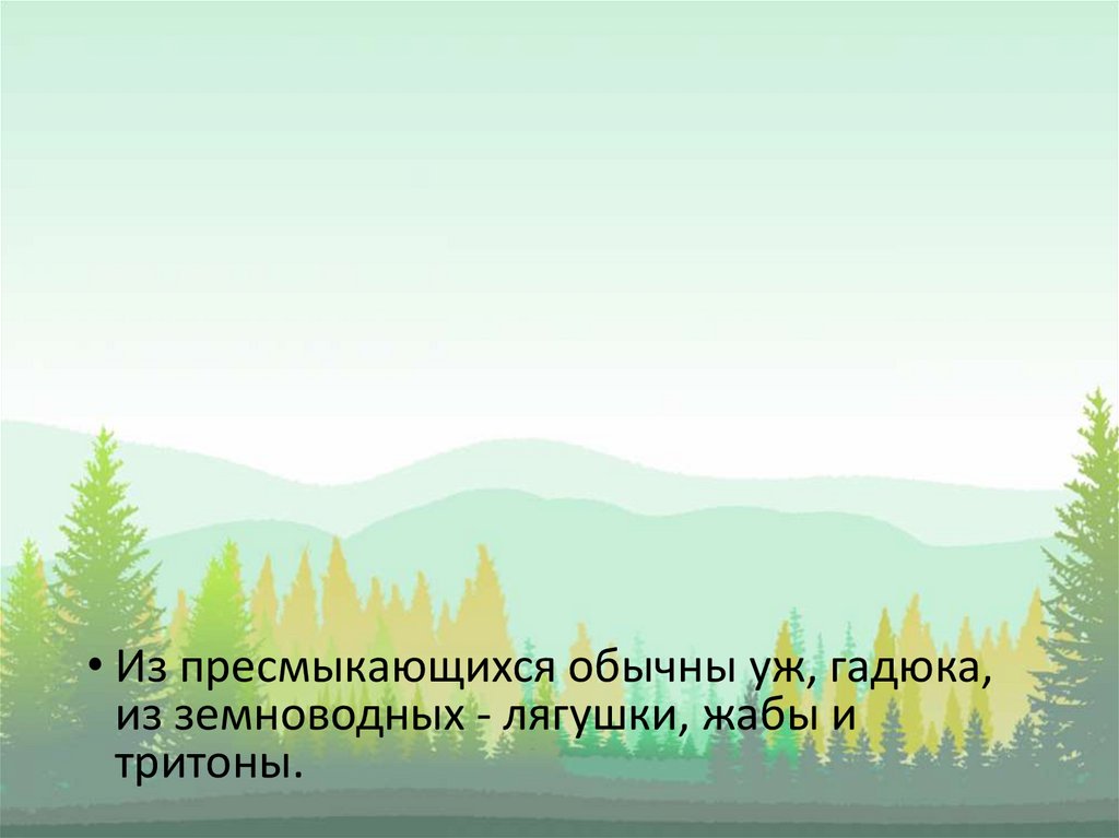 • Из пресмыкающихся обычны уж, гадюка,из земноводных - лягушки, жабы и
