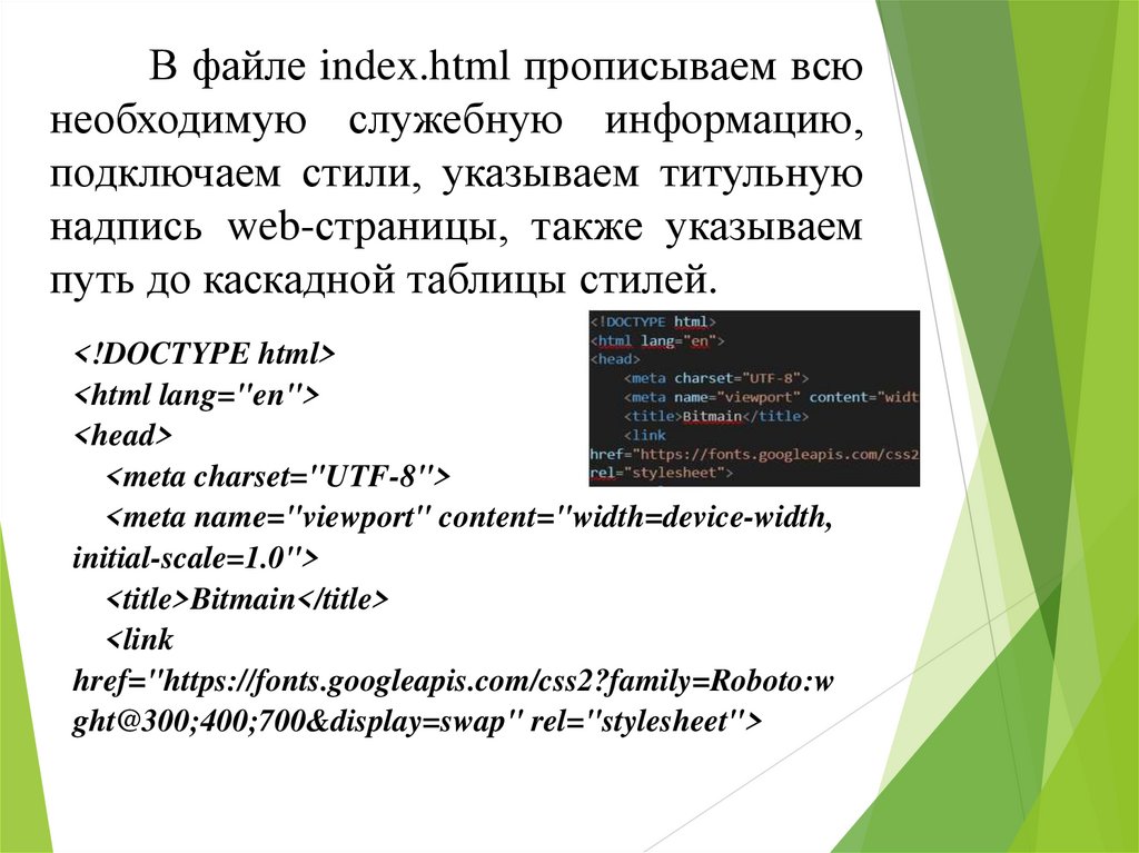 В файле index.html прописываем всюнеобходимую служебную информацию,