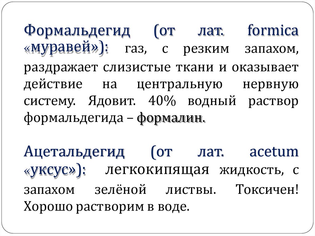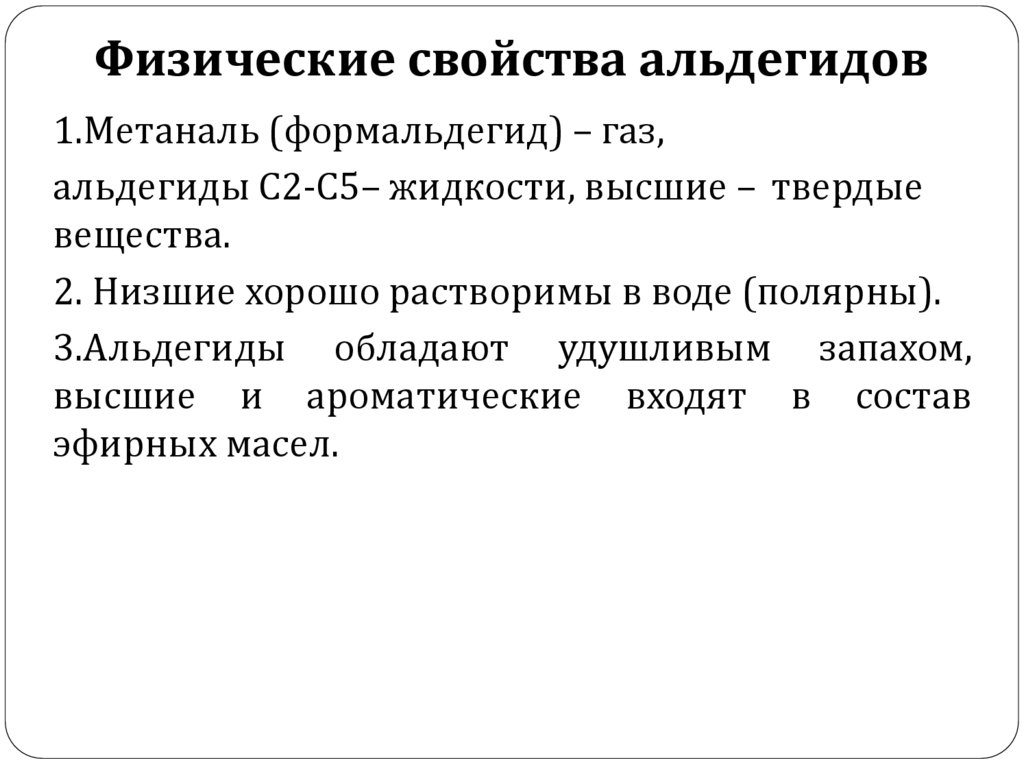 Физические свойства альдегидов1.Метаналь (формальдегид) – газ,