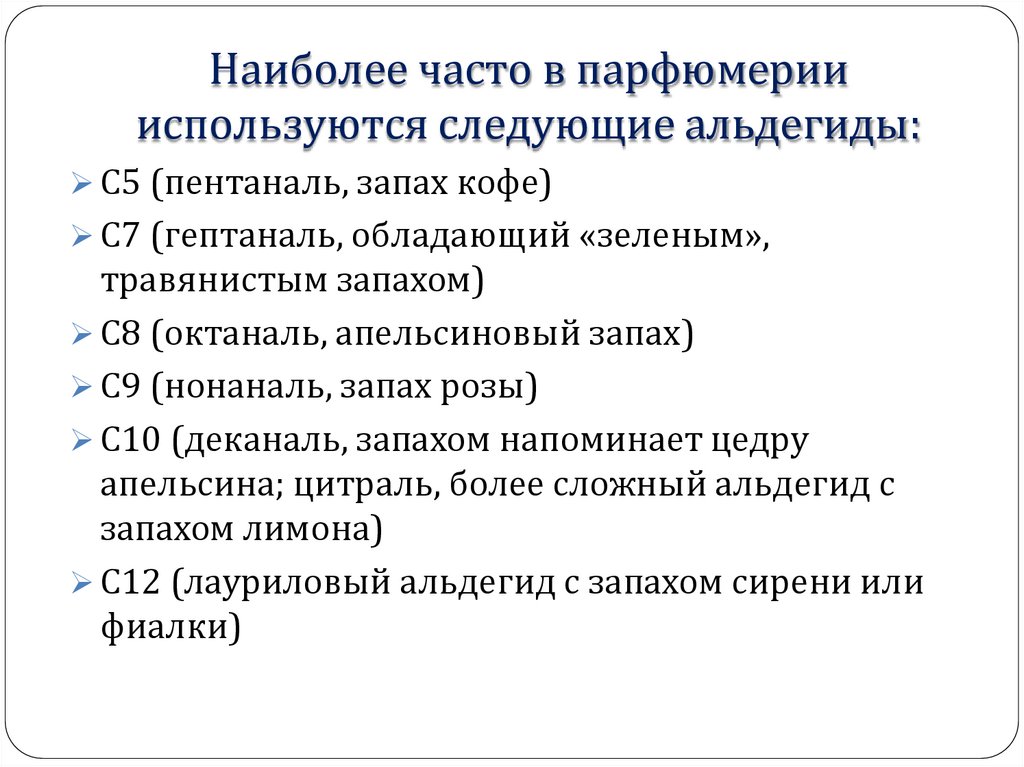 Наиболее часто в парфюмериииспользуются следующие альдегиды: