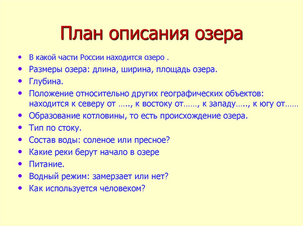 • В какой части России находится озеро .• Размеры озера: длина, ширина, площадь озера.