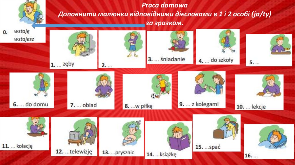 Доповнити малюнки відповідними дієсловами в 1 і 2 особі (ja/ty)