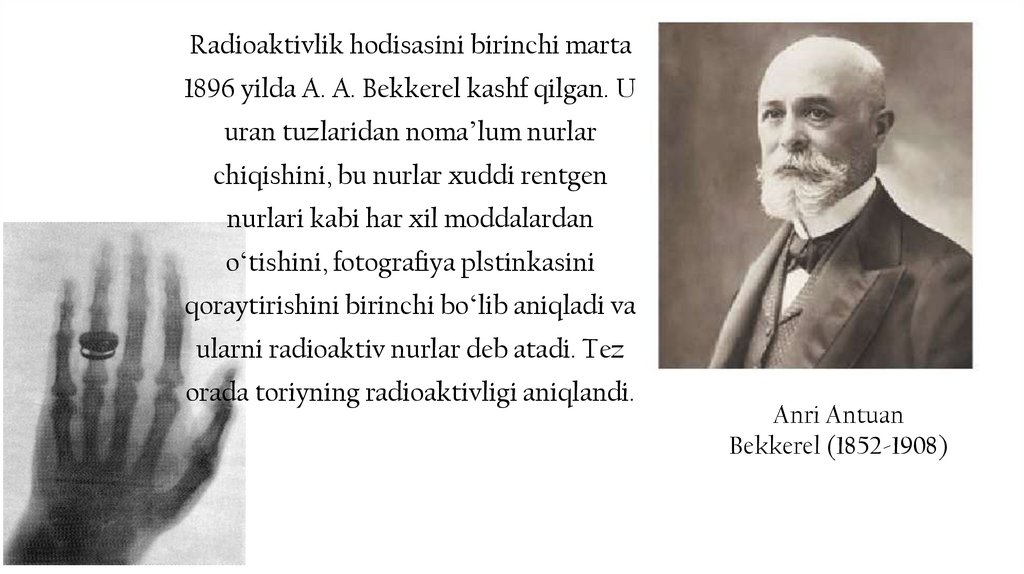 Radioaktivlik hodisasini birinchi marta1896 yilda A. A. Bekkerel kashf qilgan. U