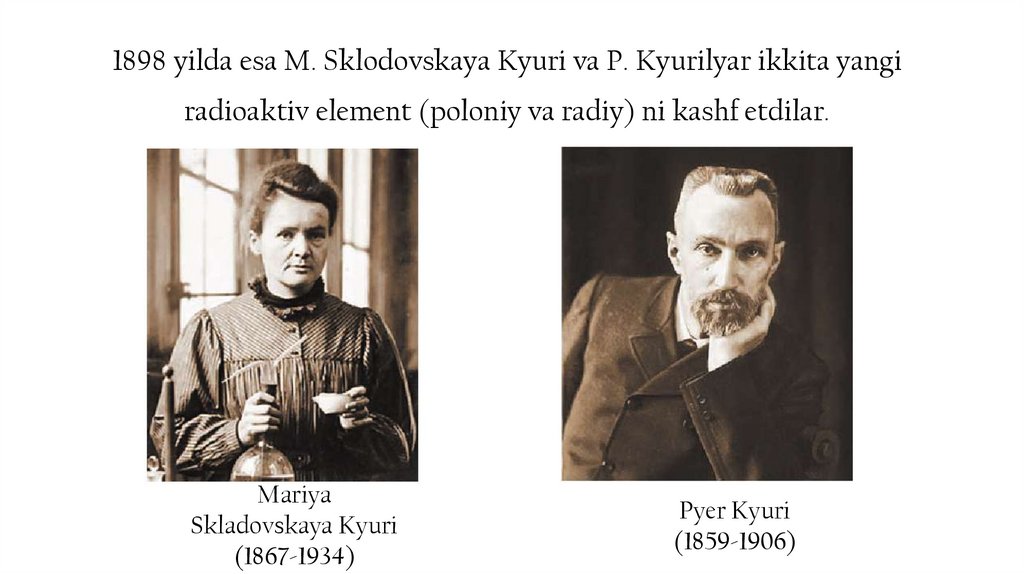 1898 yilda esa M. Sklodovskaya Kyuri va P. Kyurilyar ikkita yangiradioaktiv element (poloniy va radiy) ni kashf etdilar.