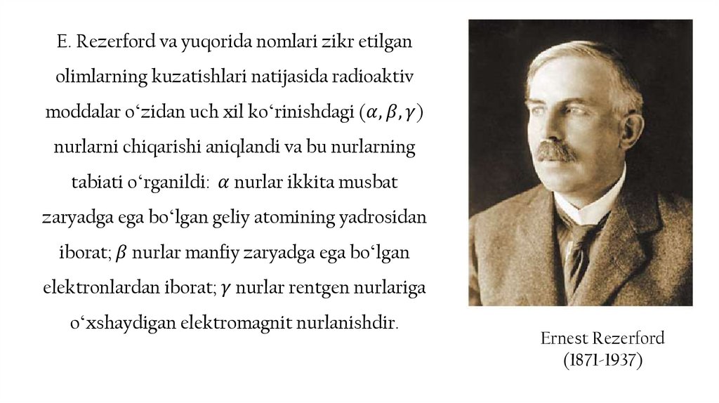 E. Rezerford va yuqorida nomlari zikr etilganolimlarning kuzatishlari natijasida radioaktiv