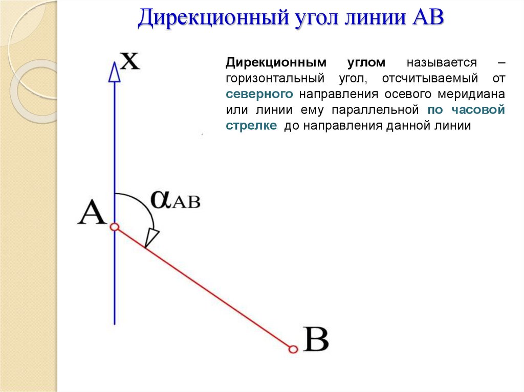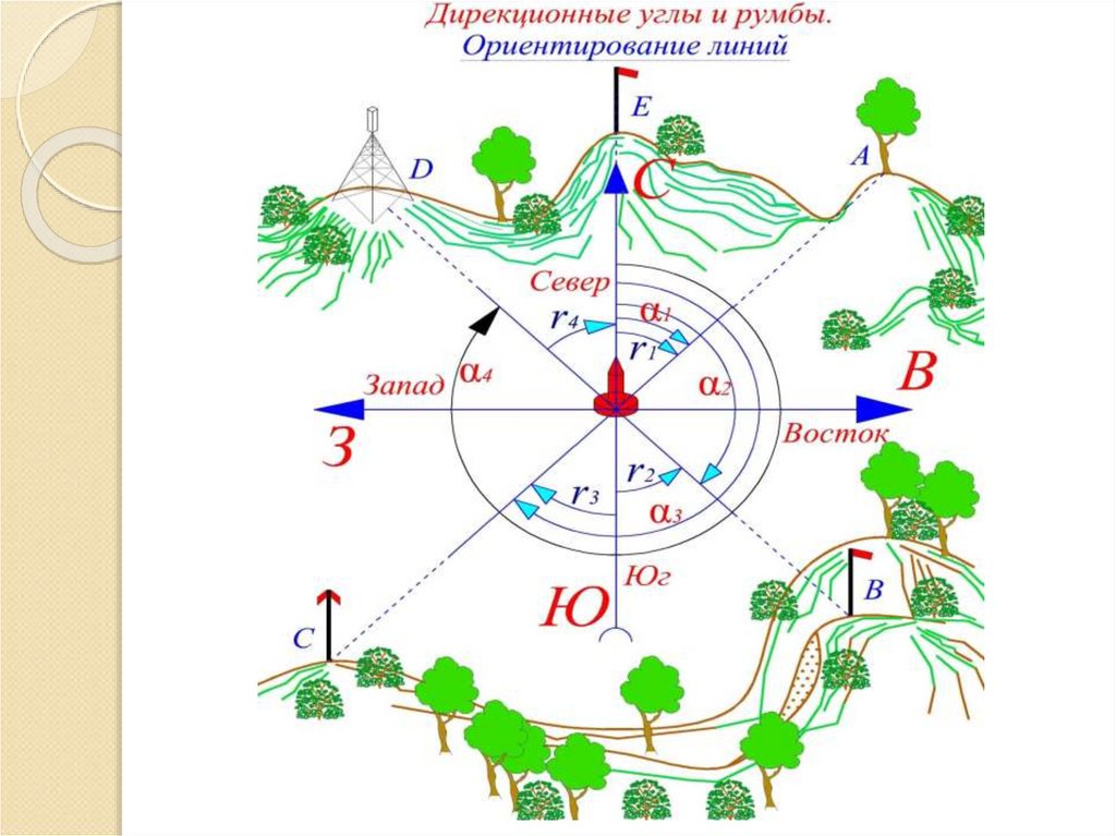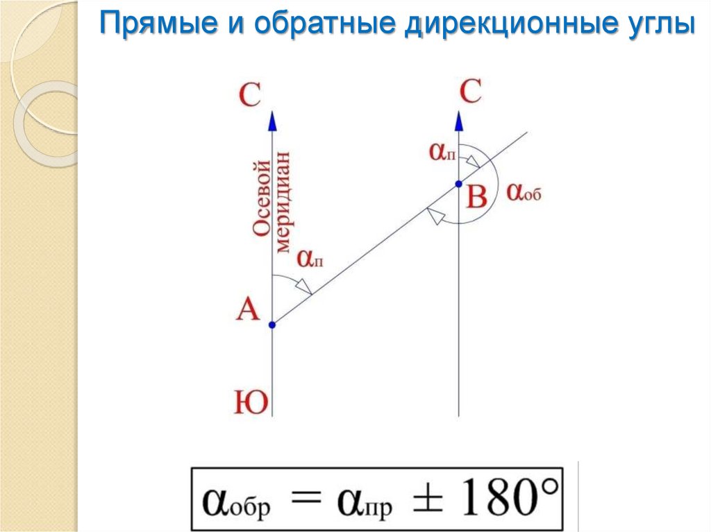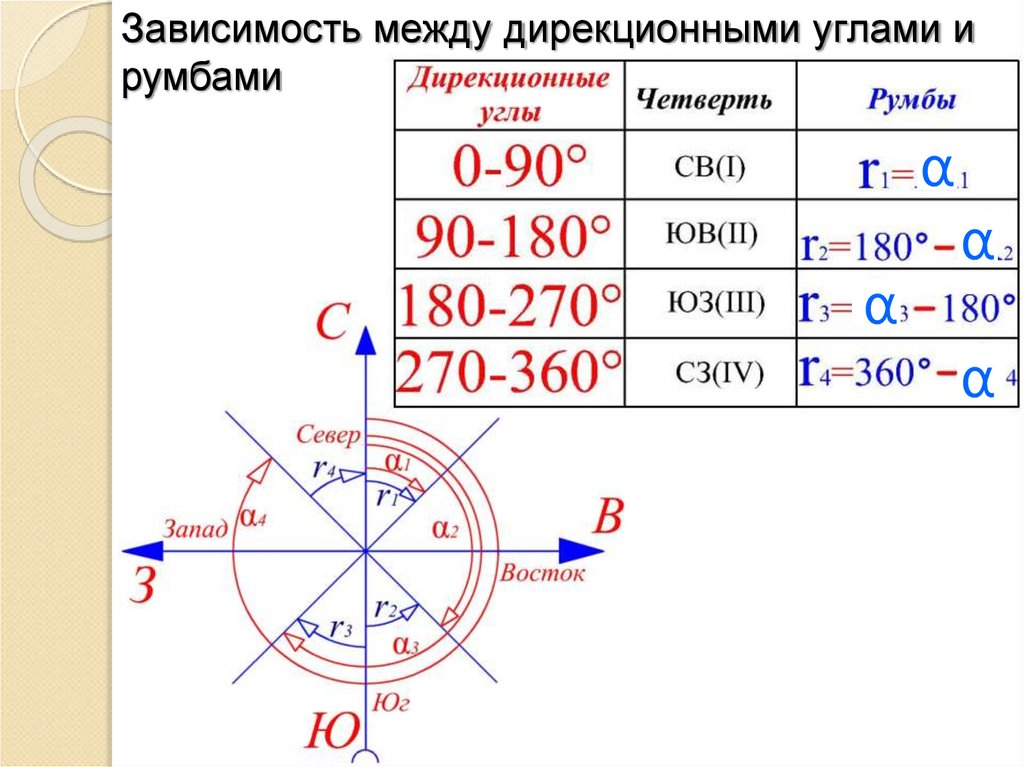 Прямые и обратные дирекционные углы4. Румб –это острый угол, отсчитываемый от ближайшего направления осевого меридиана (северного или южного) или линии ему