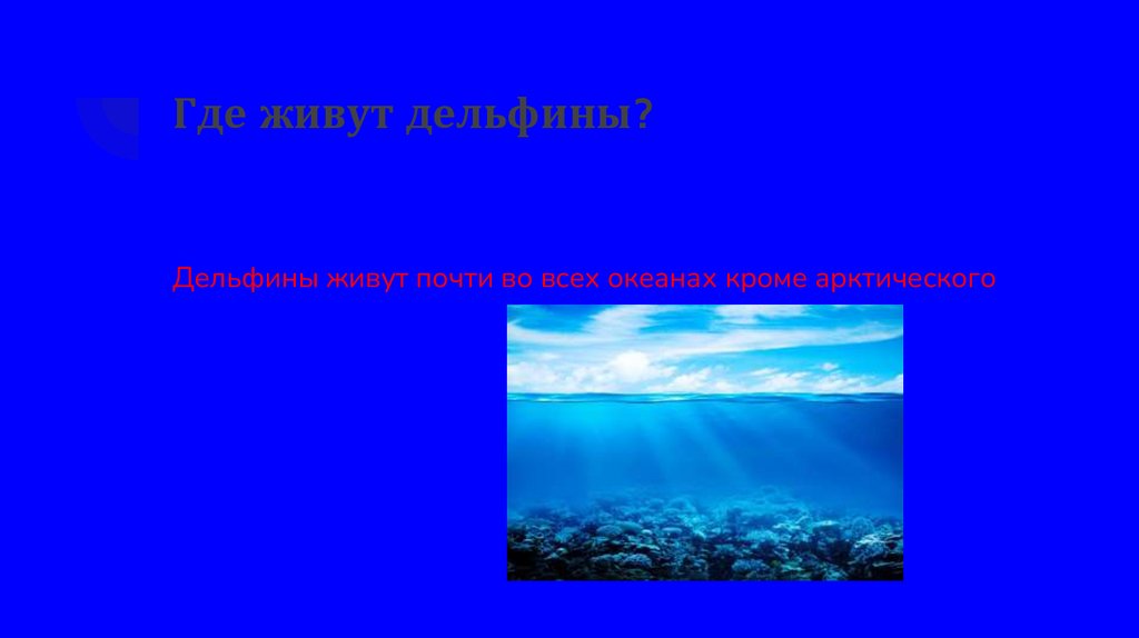 Где живут дельфины?Дельфины живут почти во всех океанах кроме арктического