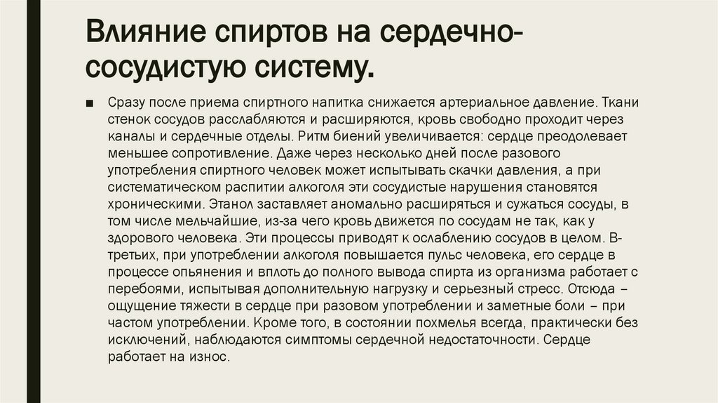 Влияние спиртов на сердечнососудистую систему.■ Сразу после приема спиртного напитка снижается артериальное давление. Ткани