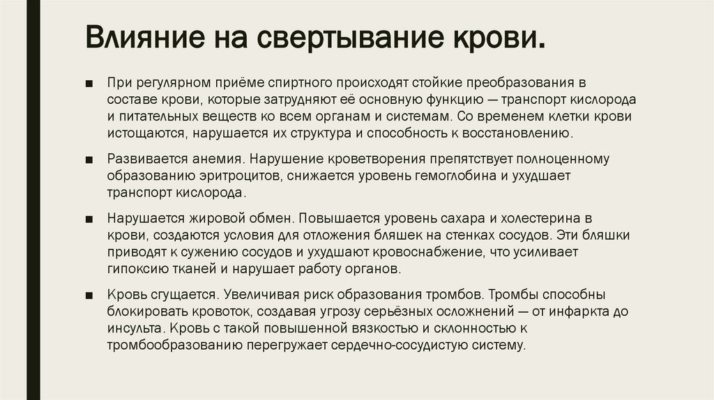 Влияние на свертывание крови.■ При регулярном приёме спиртного происходят стойкие преобразования в