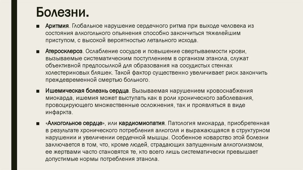 серьезных заболеваний сердца. Пристрастие к спиртным напиткам ухудшает