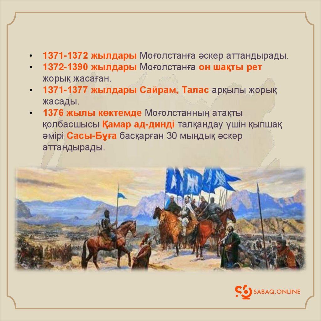 1371-1372 жылдары Моғолстанға әскер аттандырады.